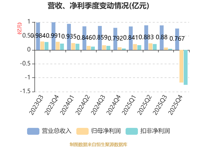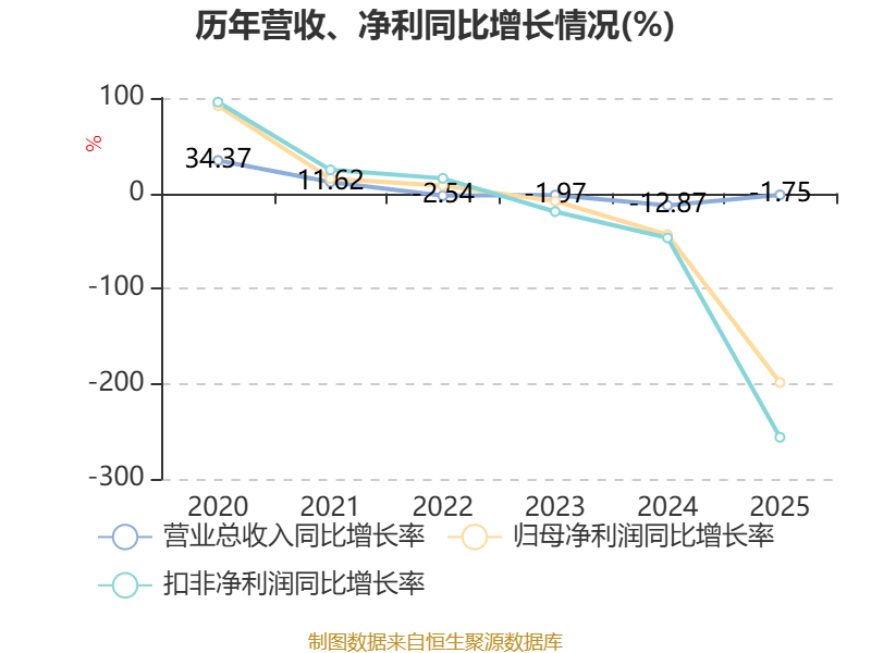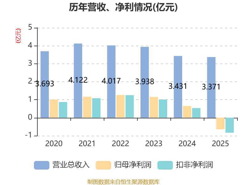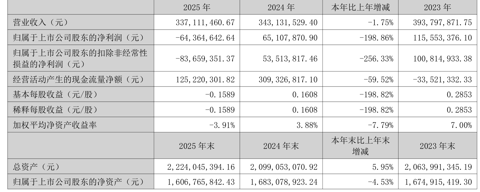 中证智能财讯恒基达鑫(002492)4月11日披露2025年年度报告。2025年,公司实现营业总收入3.37亿元,同比下降1.75%;归母净利润亏损6436.46万元,上年同期盈利6510.79万元;扣非净利润亏损8365.94万元,上年同期盈利5351.38万元;经营活动产生的现金流量净额为1.25亿元,同比下降59.52%;报告期内,恒基达鑫基本每股收益为-0.1589元,加权平均净资产收益率为-3.91%。