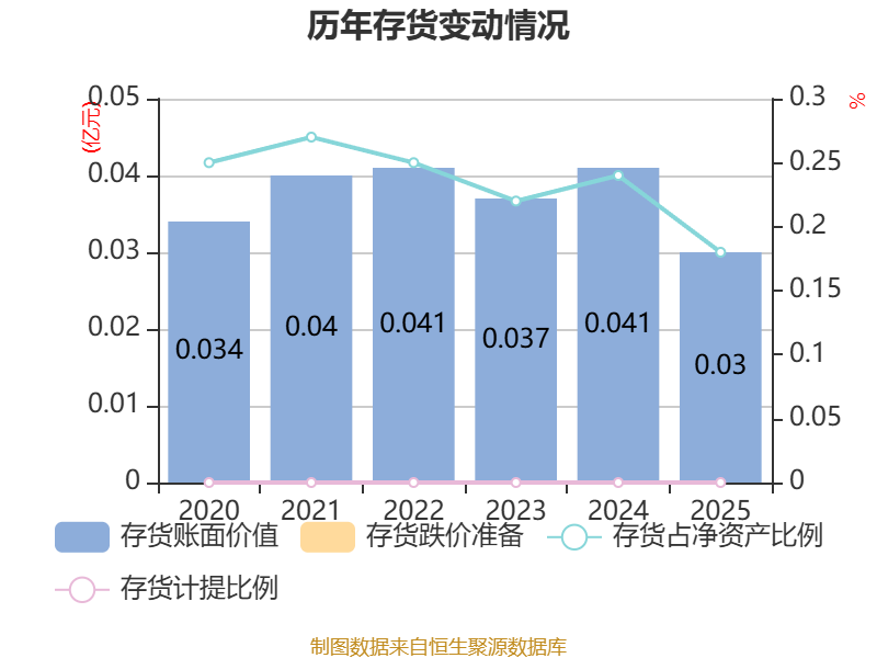 从存货变动来看,截至2025年末,公司存货账面价值为296.03万元,占净资产的0.18%,较上年末减少111.89万元。公司本期没有计提存货跌价准备。