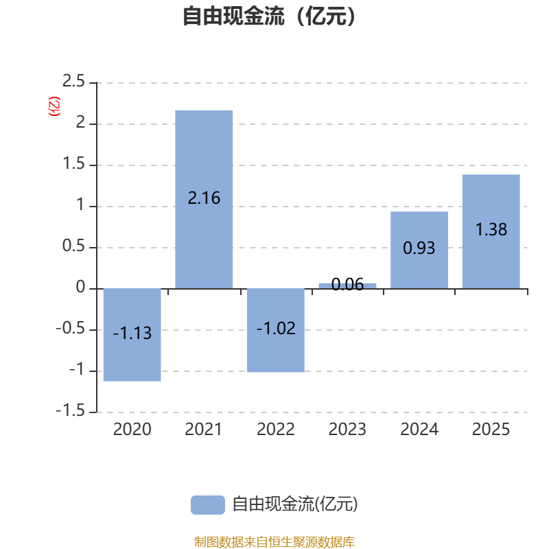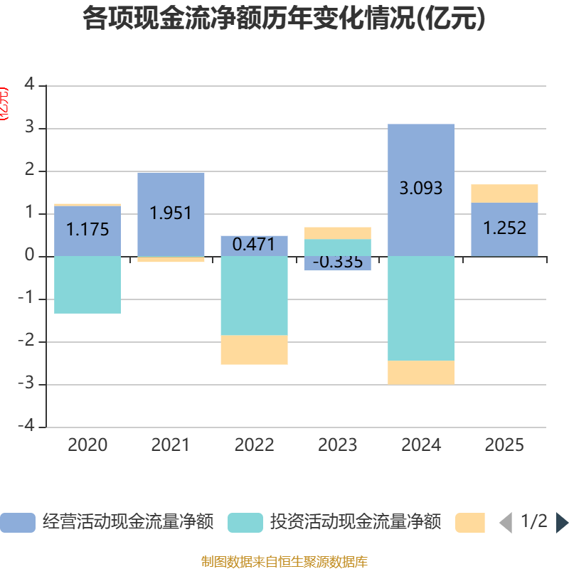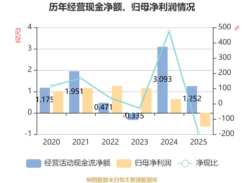 截至2025年,公司经营活动现金流净额为1.25亿元,同比下降59.52%;筹资活动现金流净额4279.63万元,同比增加9857.29万元;投资活动现金流净额-56.02万元,上年同期为-2.45亿元。