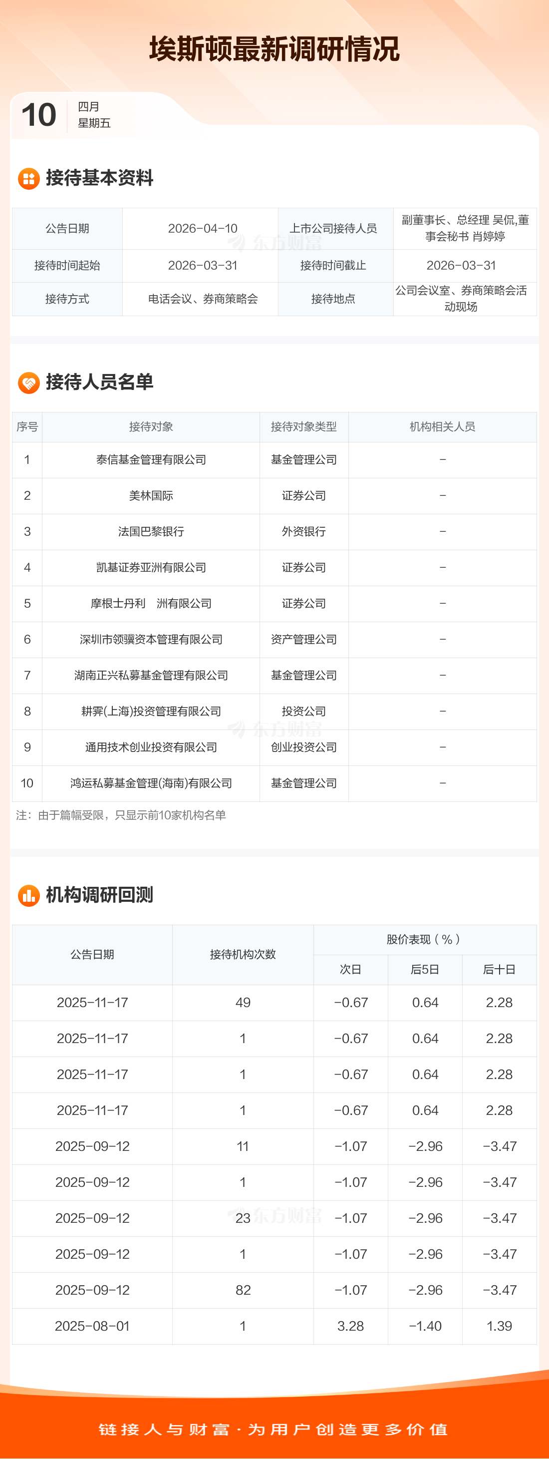 埃斯顿4月10日公告称,3月31日接待泰信基金管理有限公司等87家机构调研。接待人员包括副董事长、总经理 吴侃,董事会秘书 肖婷婷。