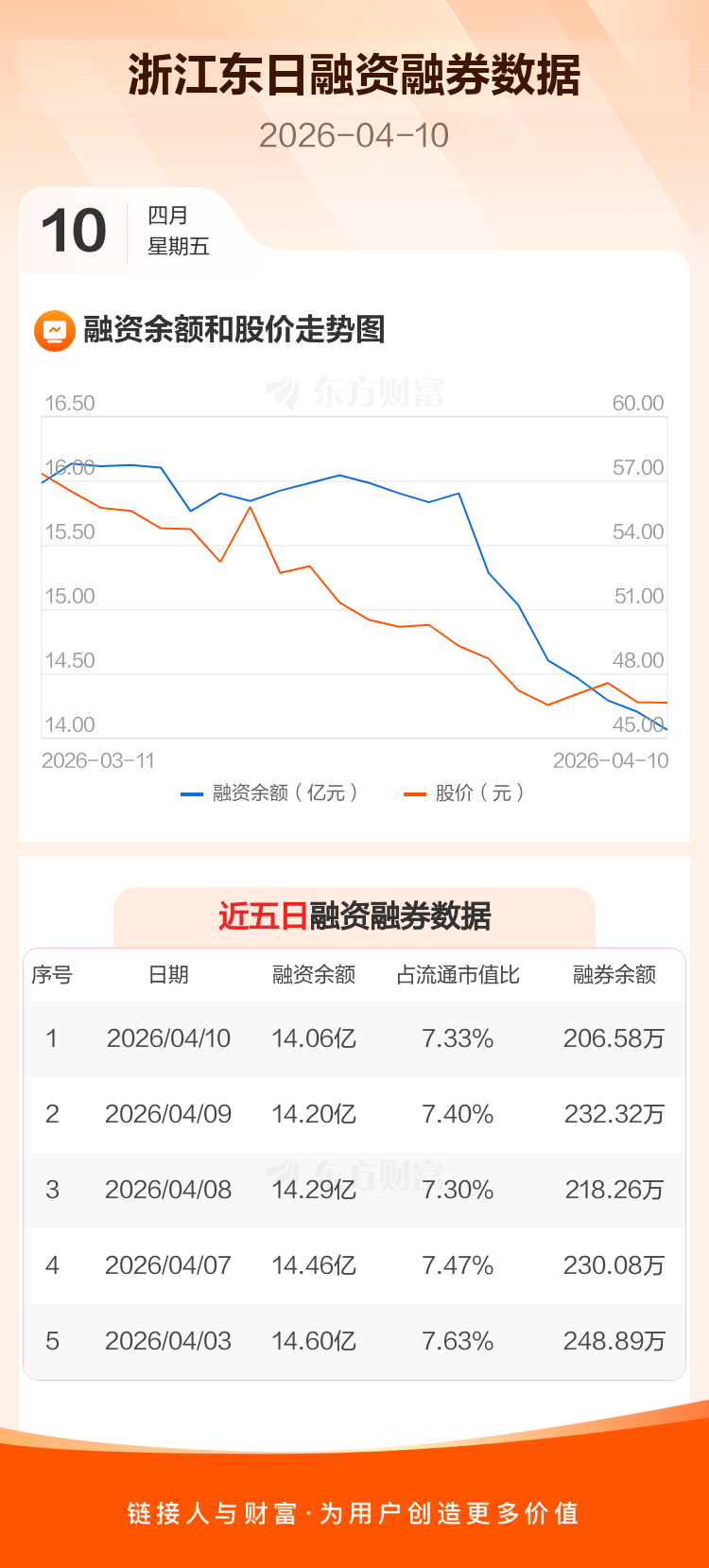 交易所最新数据显示,浙江东日于2026年4月10日获融资买入819.05万元,融资偿还2269.02万元,当日融资净偿还1449.98万元。目前,该股融资余额14.06亿,占流通市值比例为7.33%。