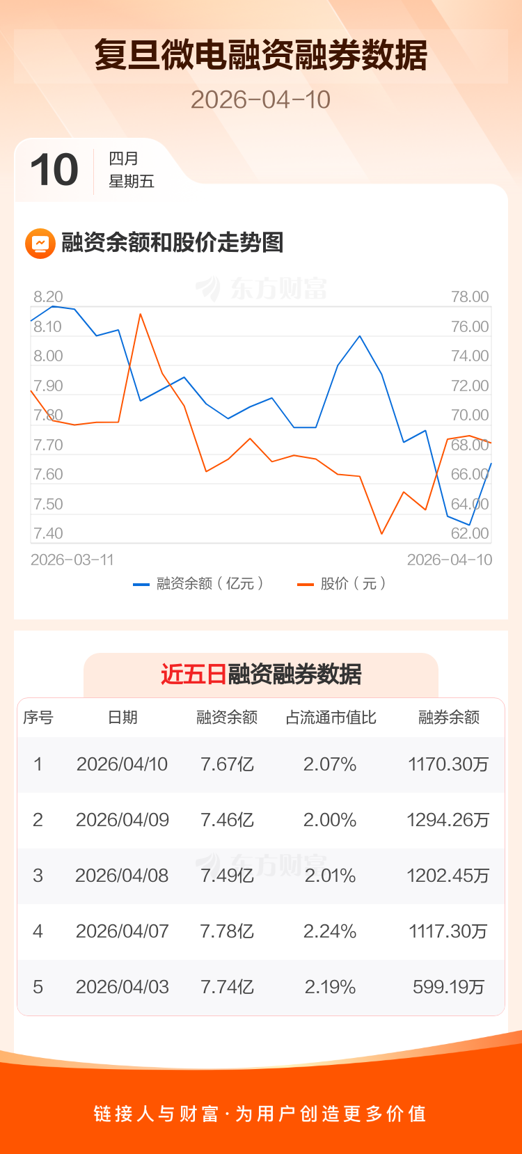 交易所最新数据显示,复旦微电于2026年4月10日获融资买入5904.86万元,融资偿还3825.03万元,当日融资净买入2079.83万元。目前,该股融资余额7.67亿,占流通市值比例为2.07%。