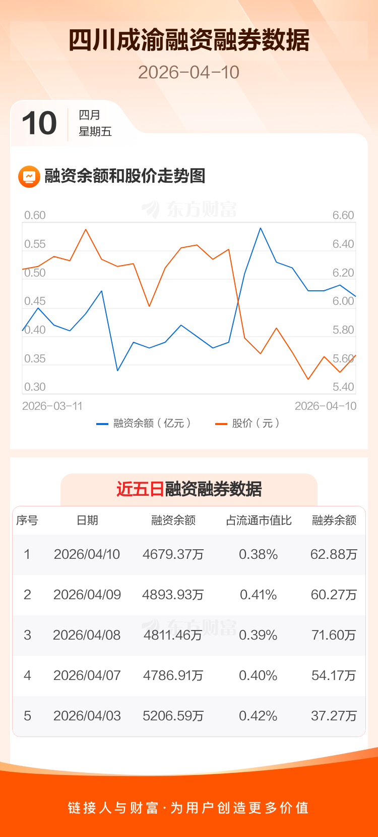 交易所最新数据显示,四川成渝于2026年4月10日获融资买入370.34万元,融资偿还584.89万元,当日融资净偿还214.56万元。目前,该股融资余额4679.37万,占流通市值比例为0.38%。