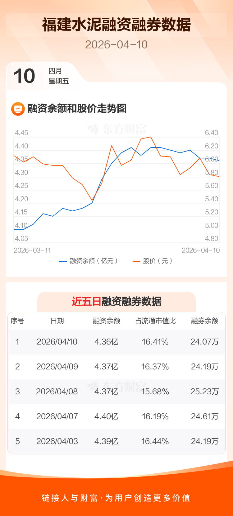 交易所最新数据显示,福建水泥于2026年4月10日获融资买入397.48万元,融资偿还521.30万元,当日融资净偿还123.82万元。目前,该股融资余额4.36亿,占流通市值比例为16.41%。