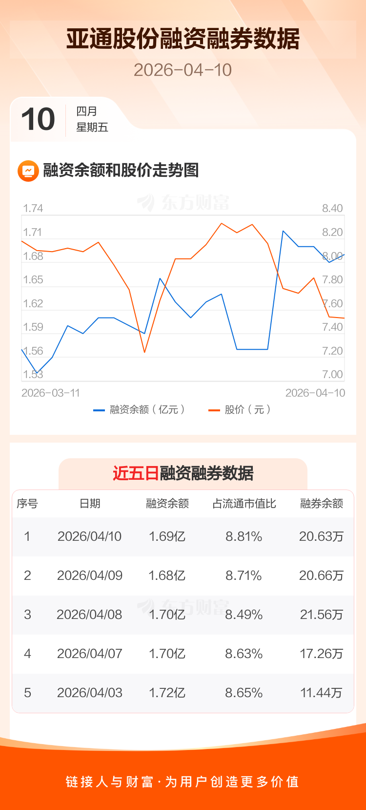 交易所最新数据显示,亚通股份于2026年4月10日获融资买入708.43万元,融资偿还536.52万元,当日融资净买入171.91万元。目前,该股融资余额1.69亿,占流通市值比例为8.81%。