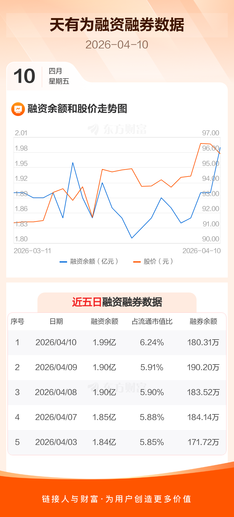 交易所最新数据显示,天有为于2026年4月10日获融资买入2274.36万元,融资偿还1362.94万元,当日融资净买入911.43万元。目前,该股融资余额1.99亿,占流通市值比例为6.24%。
