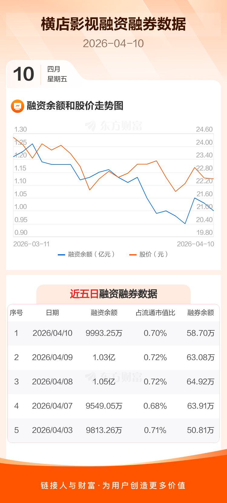 交易所最新数据显示,横店影视于2026年4月10日获融资买入1867.63万元,融资偿还2175.99万元,当日融资净偿还308.36万元。目前,该股融资余额9993.25万,占流通市值比例为0.70%。