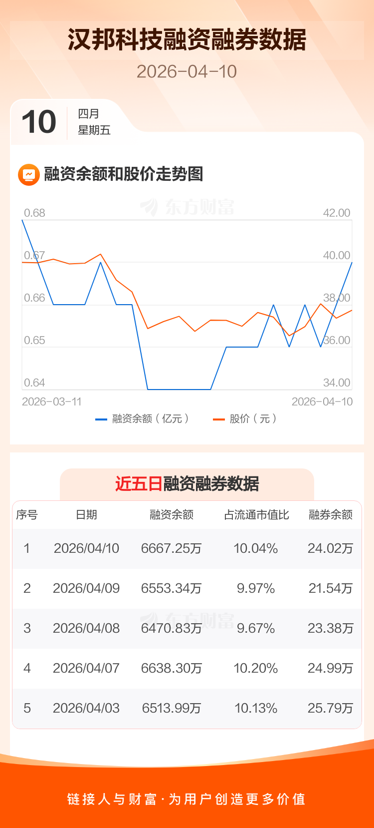 交易所最新数据显示,汉邦科技于2026年4月10日获融资买入159.72万元,融资偿还45.82万元,当日融资净买入113.91万元。目前,该股融资余额6667.25万,占流通市值比例为10.04%。