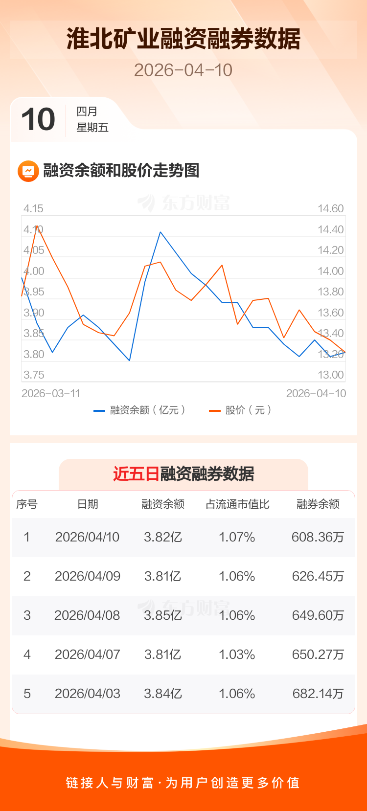 交易所最新数据显示,淮北矿业于2026年4月10日获融资买入912.98万元,融资偿还814.85万元,当日融资净买入98.13万元。目前,该股融资余额3.82亿,占流通市值比例为1.07%。