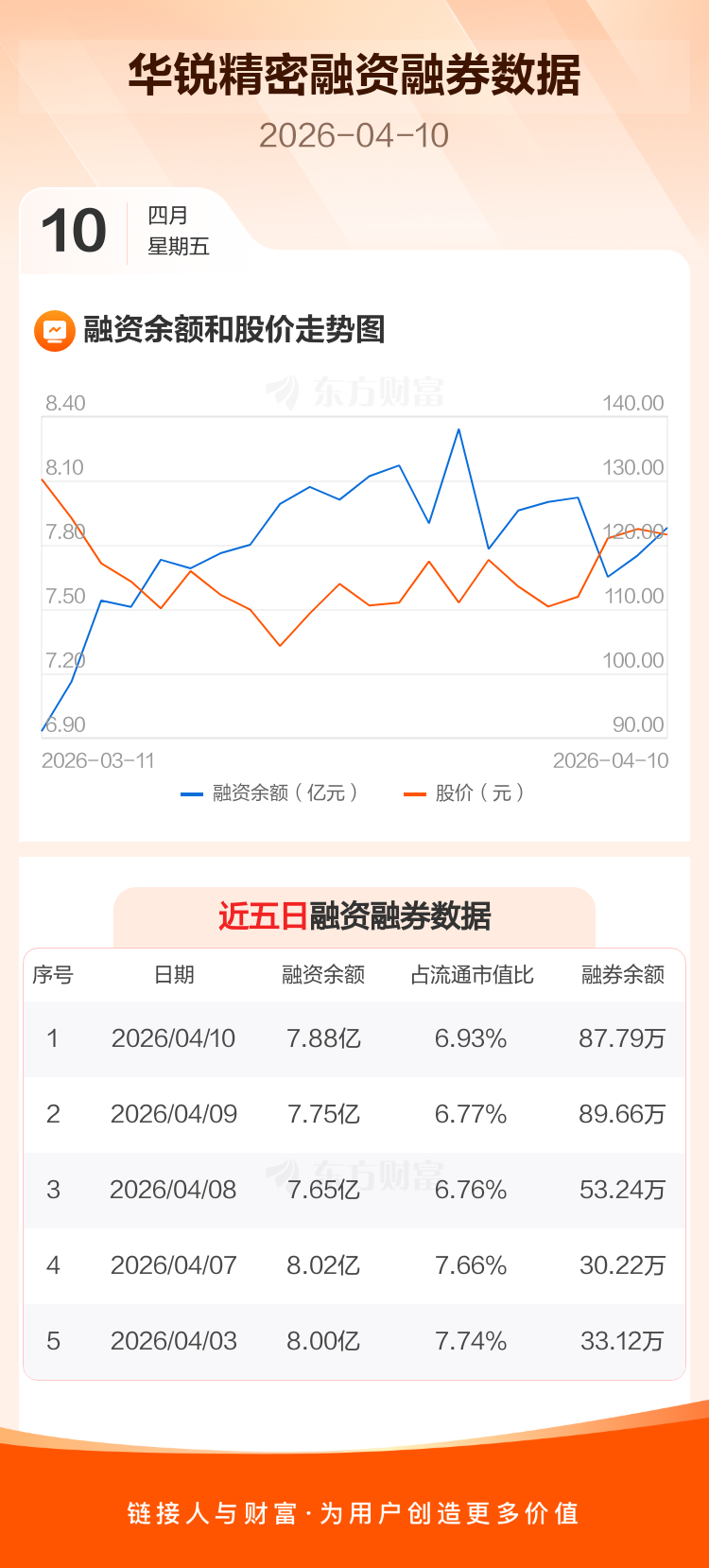 交易所最新数据显示,华锐精密于2026年4月10日获融资买入6113.00万元,融资偿还4788.68万元,当日融资净买入1324.32万元。目前,该股融资余额7.88亿,占流通市值比例为6.93%。