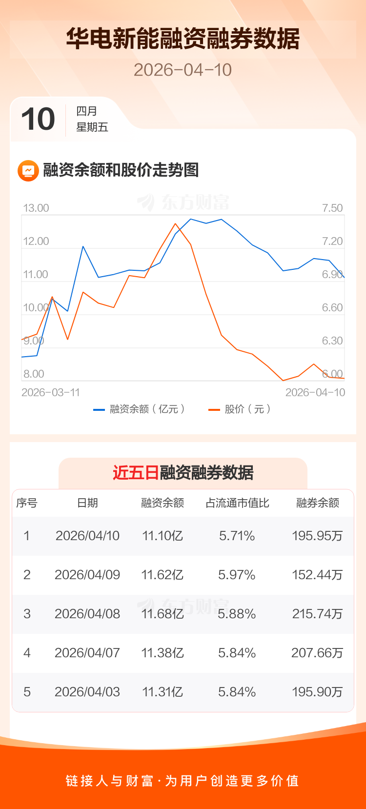 交易所最新数据显示,华电新能于2026年4月10日获融资买入6730.10万元,融资偿还1.19亿元,当日融资净偿还5209.07万元。目前,该股融资余额11.10亿,占流通市值比例为5.71%。