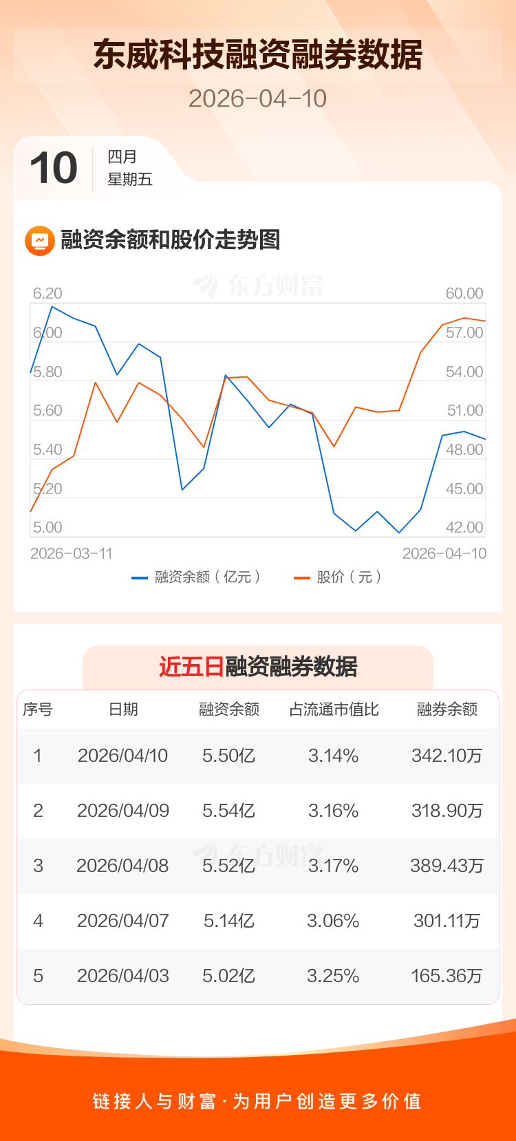 交易所最新数据显示,东威科技于2026年4月10日获融资买入7328.72万元,融资偿还7794.63万元,当日融资净偿还465.91万元。目前,该股融资余额5.50亿,占流通市值比例为3.14%。
