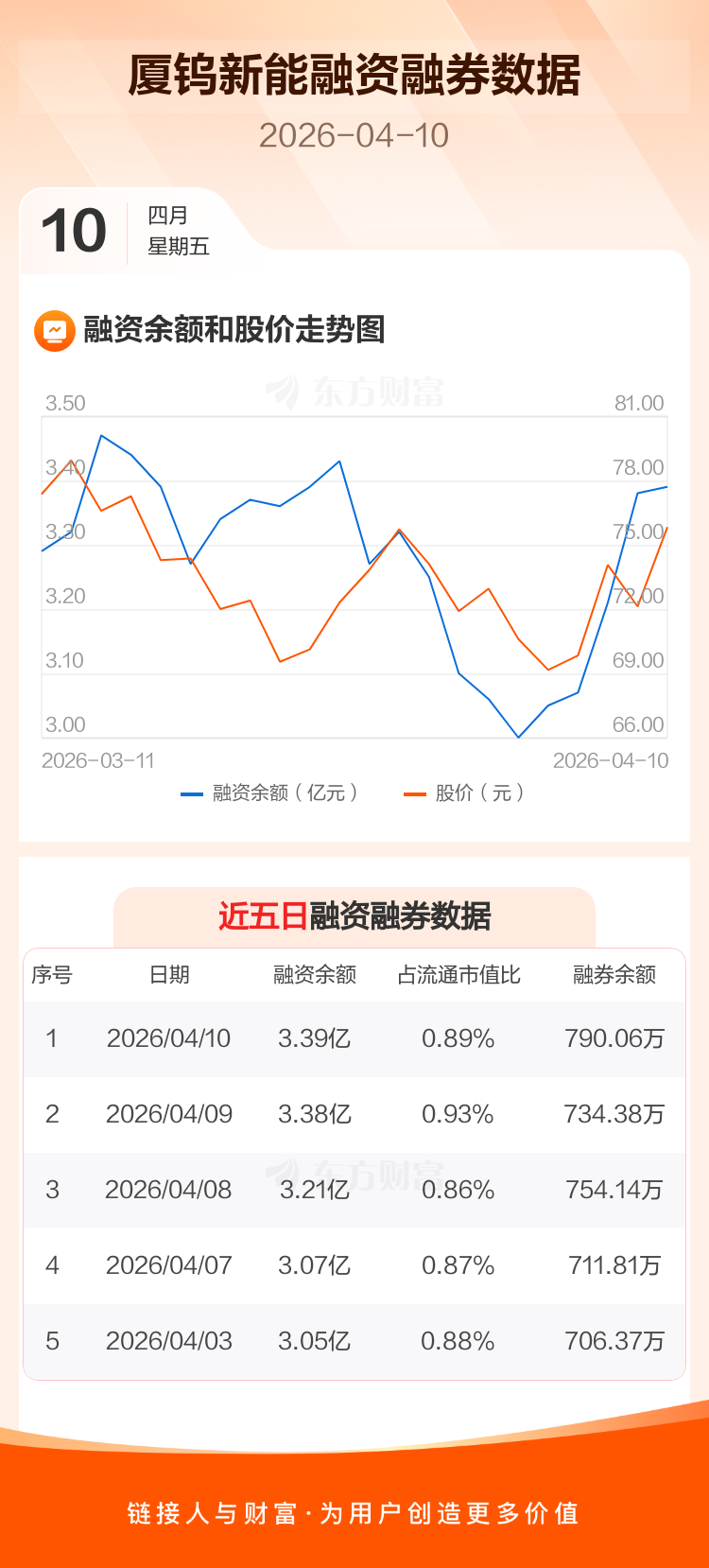 交易所最新数据显示,厦钨新能于2026年4月10日获融资买入4475.09万元,融资偿还4343.02万元,当日融资净买入132.07万元。目前,该股融资余额3.39亿,占流通市值比例为0.89%。
