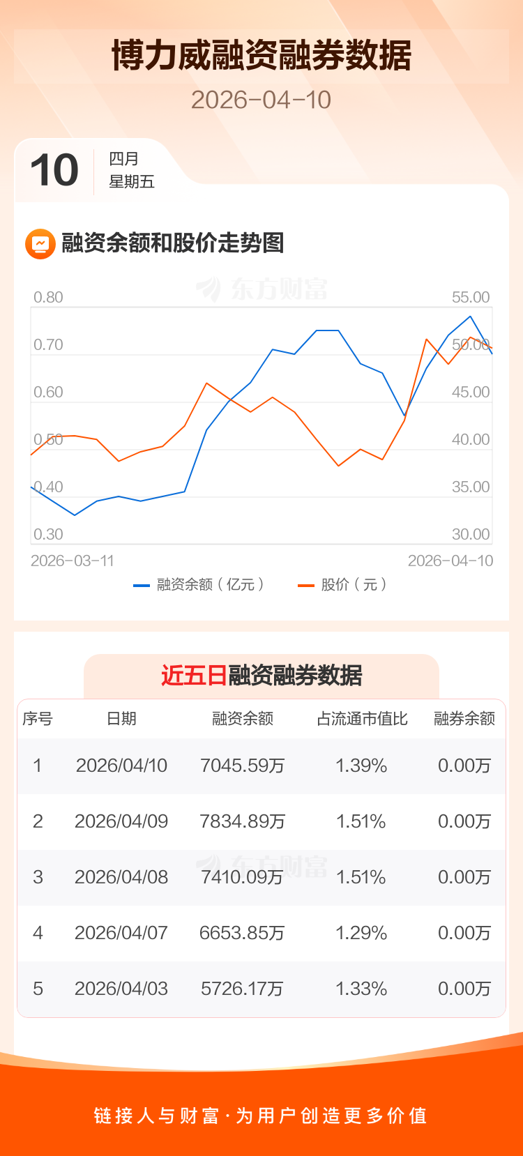 交易所最新数据显示,博力威于2026年4月10日获融资买入3773.34万元,融资偿还4562.63万元,当日融资净偿还789.3万元。目前,该股融资余额7045.59万,占流通市值比例为1.39%。