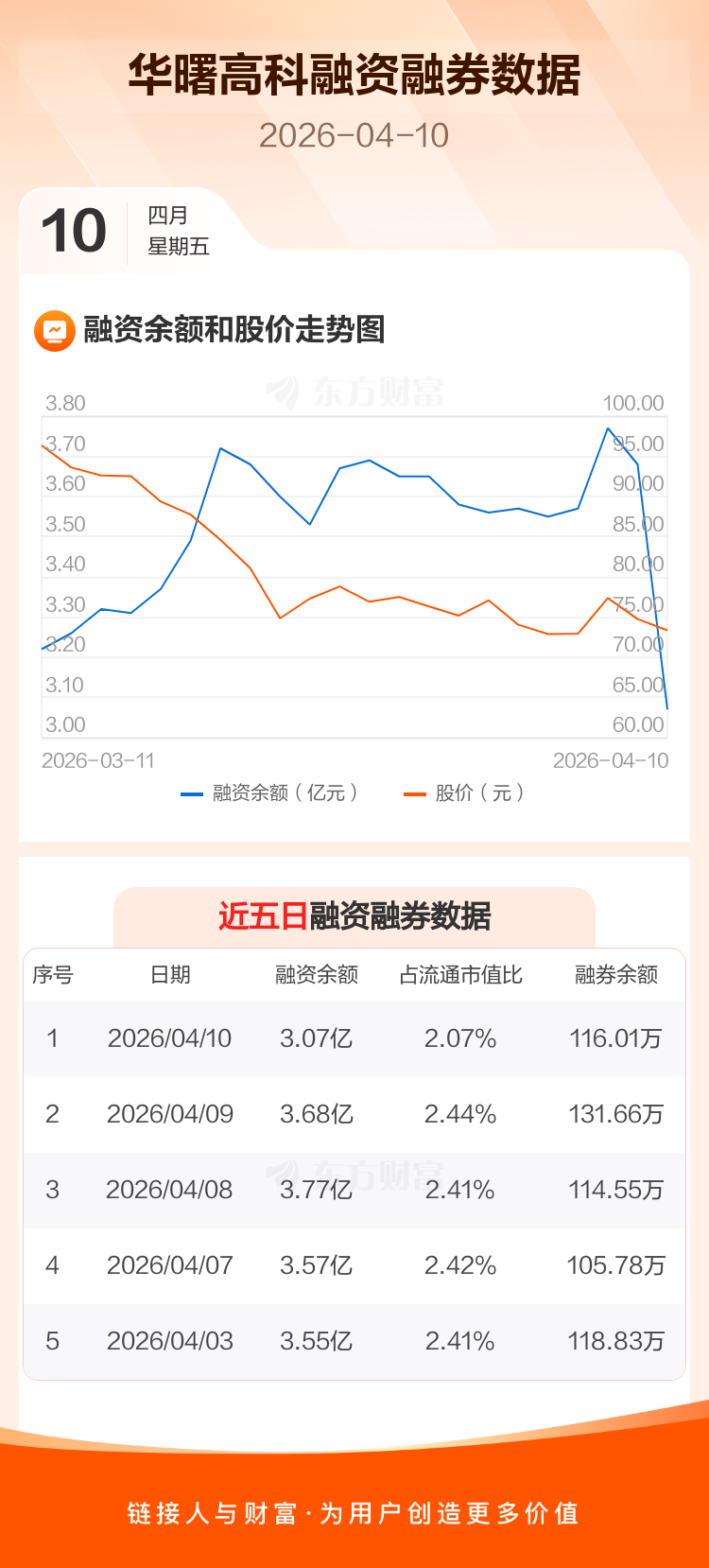 交易所最新数据显示,华曙高科于2026年4月10日获融资买入1692.58万元,融资偿还7877.58万元,当日融资净偿还6185万元。目前,该股融资余额3.07亿,占流通市值比例为2.07%。