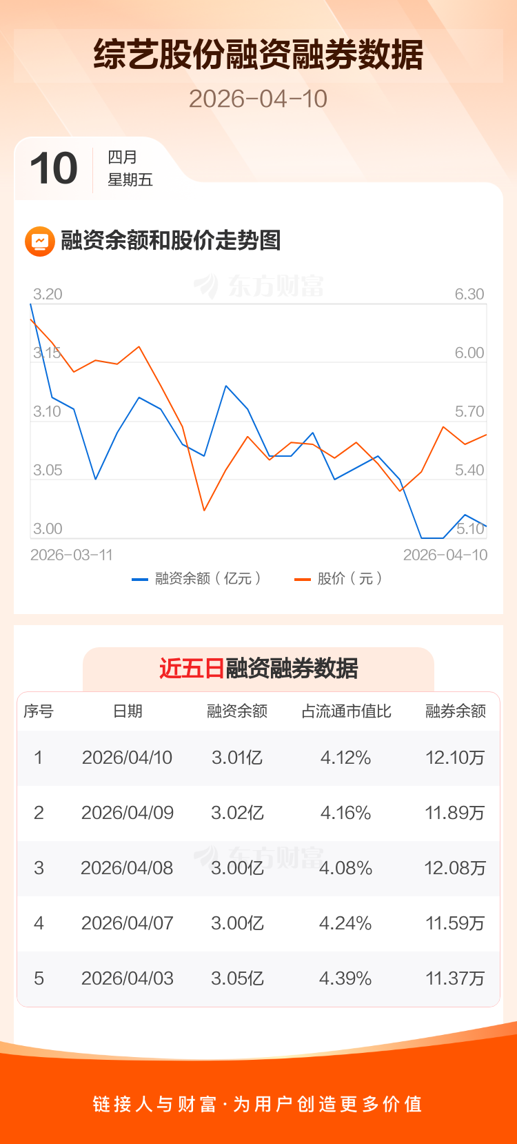 交易所最新数据显示,综艺股份于2026年4月10日获融资买入854.55万元,融资偿还890.77万元,当日融资净偿还36.22万元。目前,该股融资余额3.01亿,占流通市值比例为4.12%。