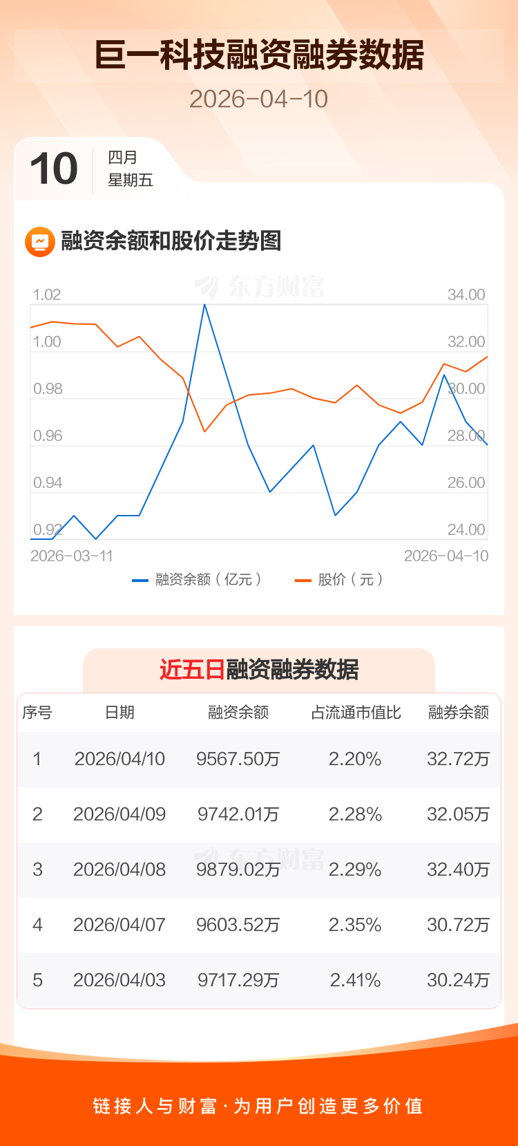 交易所最新数据显示,巨一科技于2026年4月10日获融资买入387.15万元,融资偿还561.66万元,当日融资净偿还174.51万元。目前,该股融资余额9567.50万,占流通市值比例为2.20%。