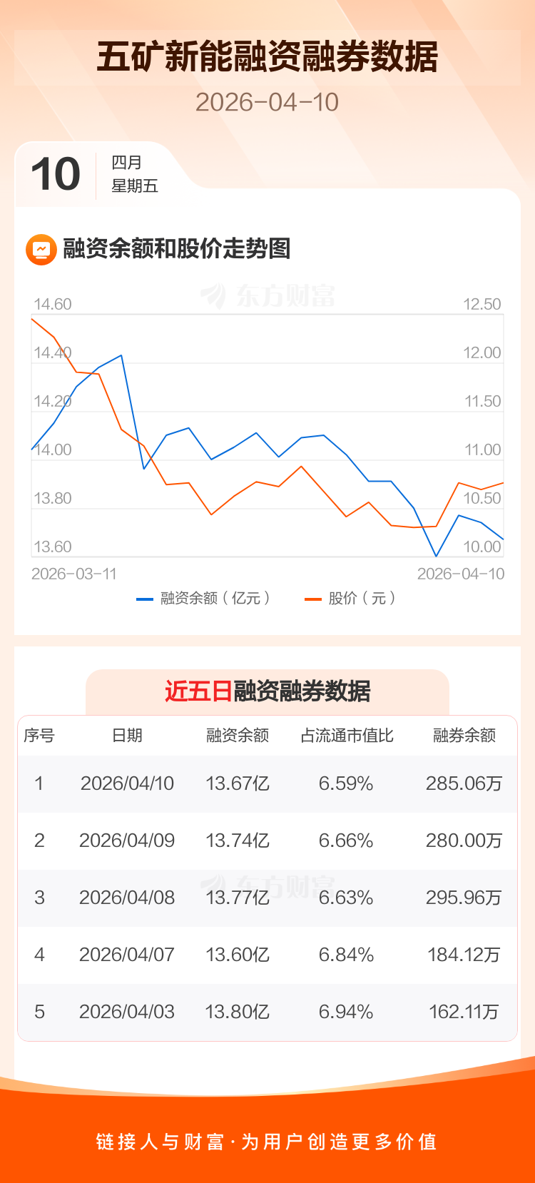 交易所最新数据显示,五矿新能于2026年4月10日获融资买入2892.95万元,融资偿还3510.81万元,当日融资净偿还617.87万元。目前,该股融资余额13.67亿,占流通市值比例为6.59%。
