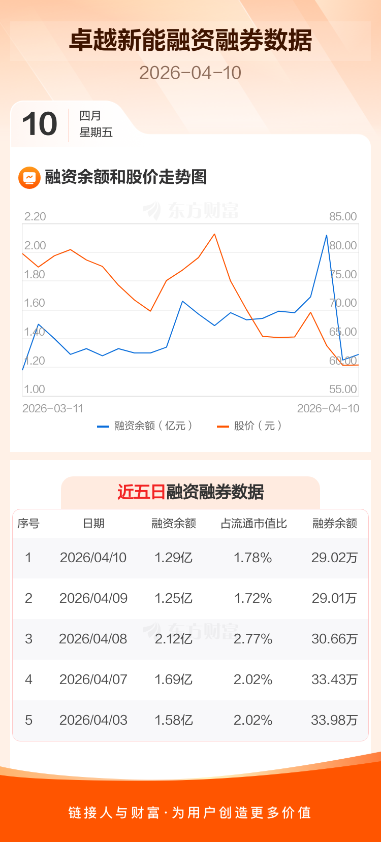 交易所最新数据显示,卓越新能于2026年4月10日获融资买入2021.80万元,融资偿还1568.49万元,当日融资净买入453.31万元。目前,该股融资余额1.29亿,占流通市值比例为1.78%。