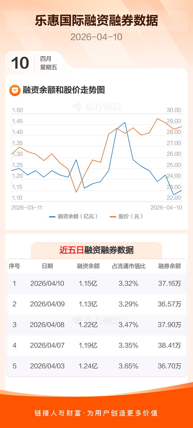 交易所最新数据显示,乐惠国际于2026年4月10日获融资买入1476.69万元,融资偿还1283.13万元,当日融资净买入193.56万元。目前,该股融资余额1.15亿,占流通市值比例为3.32%。