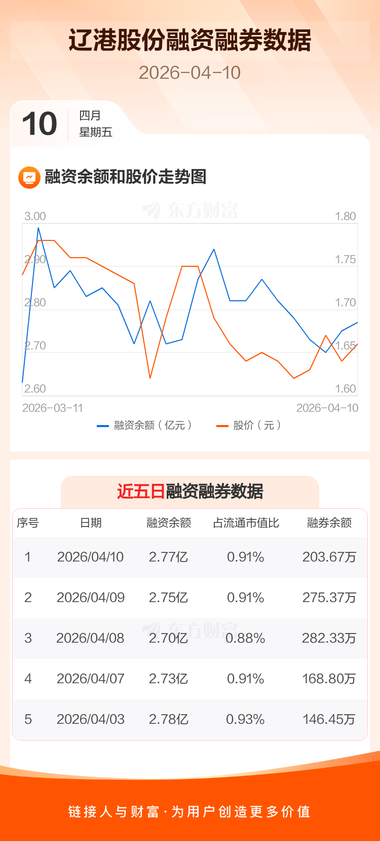 交易所最新数据显示,辽港股份于2026年4月10日获融资买入4171.00万元,融资偿还4023.45万元,当日融资净买入147.55万元。目前,该股融资余额2.77亿,占流通市值比例为0.91%。