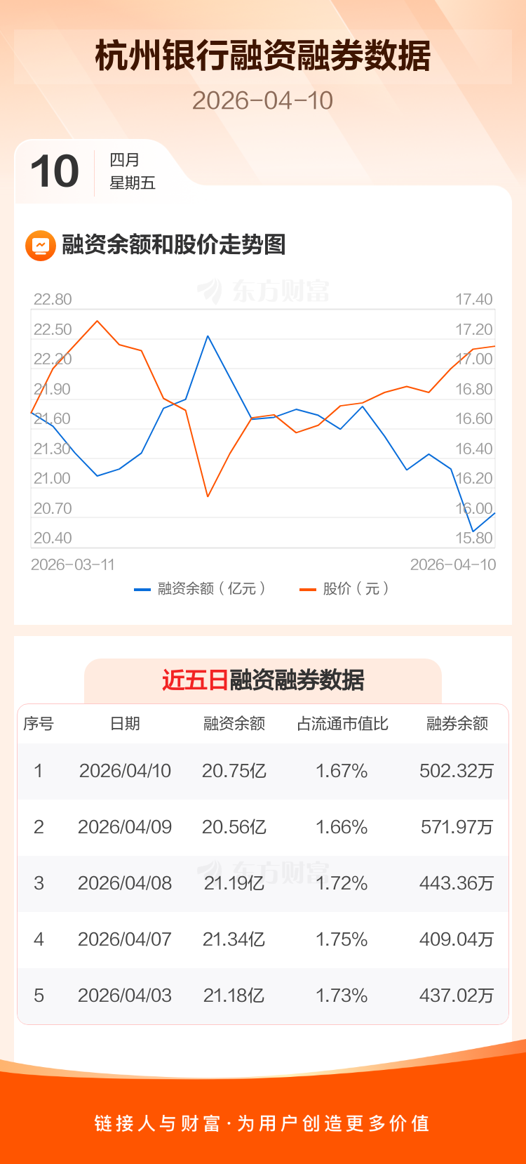 交易所最新数据显示,杭州银行于2026年4月10日获融资买入4096.85万元,融资偿还2192.27万元,当日融资净买入1904.59万元。目前,该股融资余额20.75亿,占流通市值比例为1.67%。