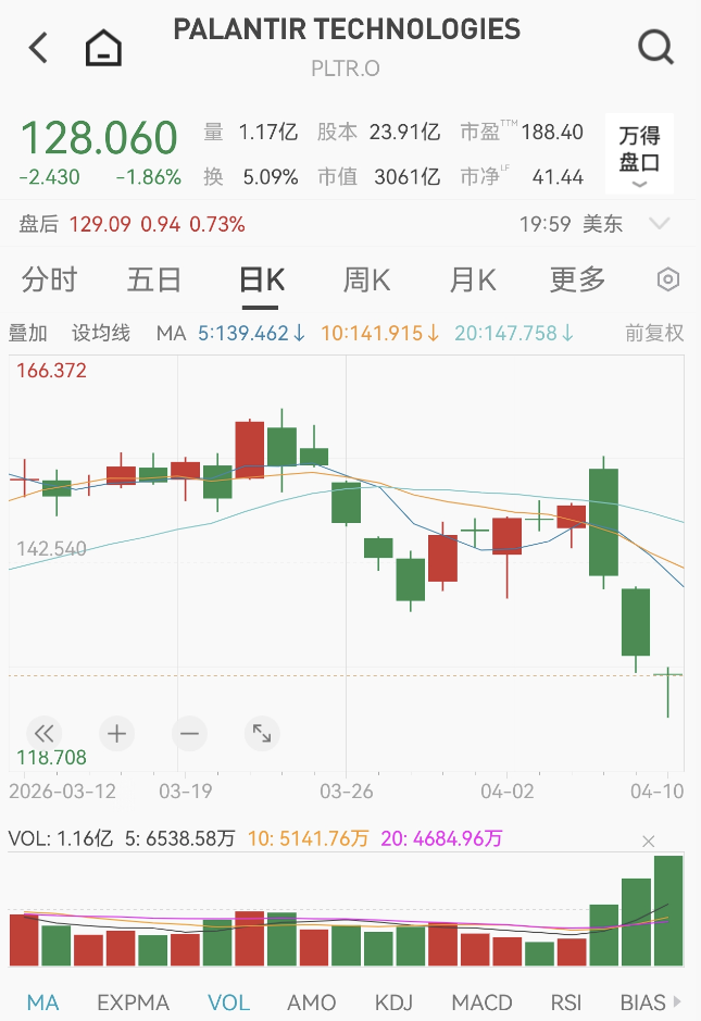 最近三个交易日,Palantir股价持续走低。4月10日,Palantir收跌1.86%,报128.06美元/股;年内跌幅达27.95%。