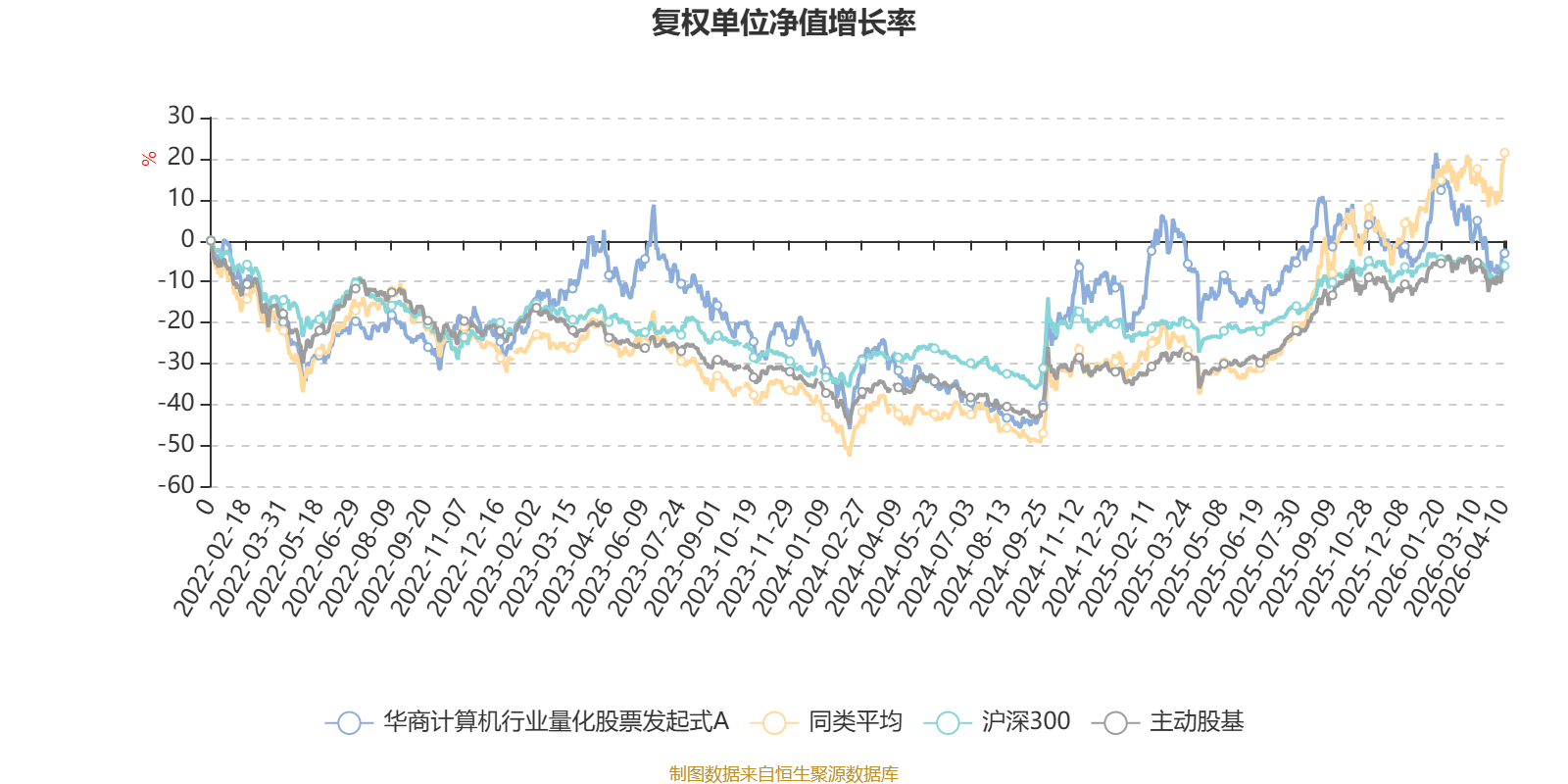 截至4月10日,华商计算机行业量化股票发起式A近三个月复权单位净值增长率为-11.72%,位于同类可比基金59/63;近半年复权单位净值增长率为-6.50%,位于同类可比基金57/63;近一年复权单位净值增长率为13.87%,位于同类可比基金59/63;近三年复权单位净值增长率为0.78%,位于同类可比基金49/53。