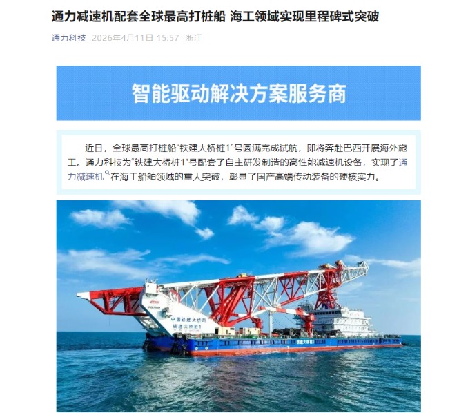 4月11日,据通力科技消息,近日,全球最高打桩船“铁建大桥桩1”号完成试航,即将奔赴巴西开展海外施工。通力科技为“铁建大桥桩1”号配套了自主研发制造的高性能减速机设备,实现了通力减速机在海工船舶领域的重大突破。