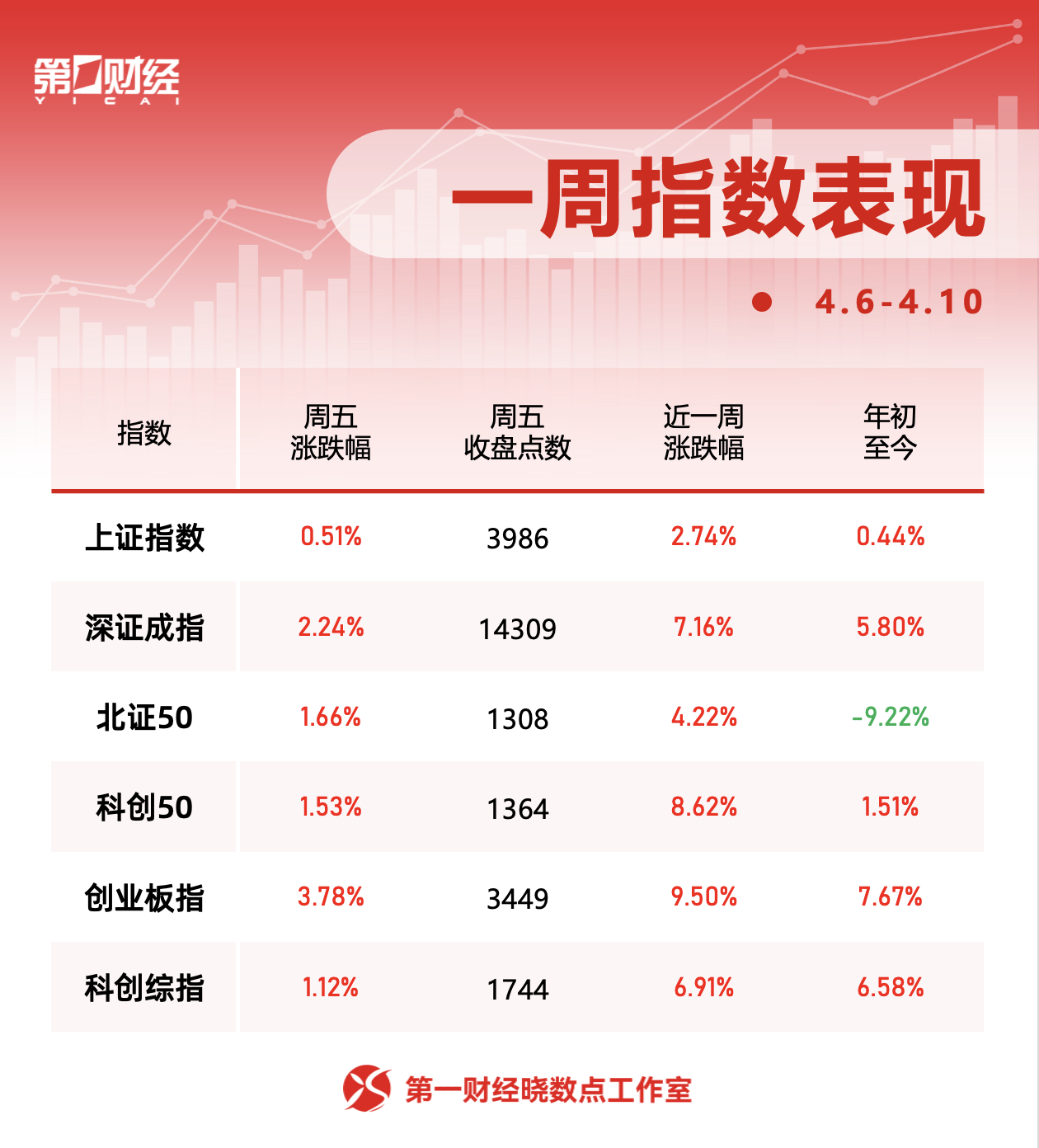 本周(4月6日至4月10日)A股指数均累计上涨,沪指本周累计涨2.74%,深成指涨7.16%,创业板指大涨9.5%,科创综指累计涨6.91%。