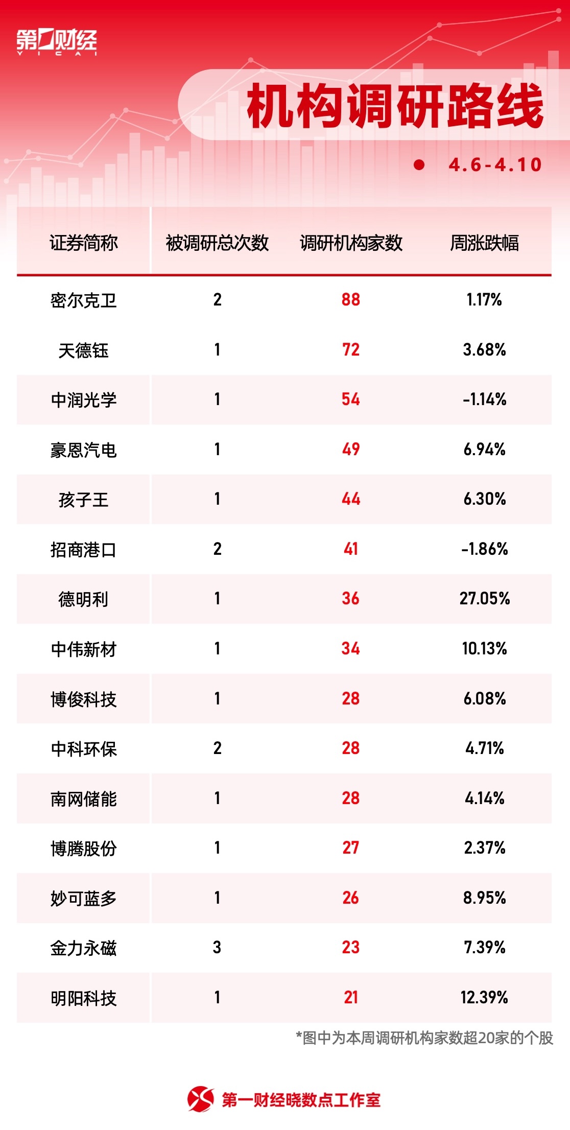 机构本周共调研了315家上市公司,其中密尔克卫最获关注,参与调研的机构达88家。此外,天德钰获超70家机构调研。