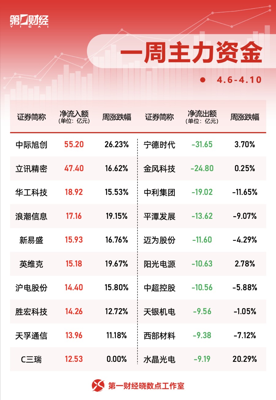 个股方面,本周中际旭创、立讯精密、华工科技获主力净流入居前,分别为55.2亿元、47.4亿元、18.92亿元;净流出方面,宁德时代、金风科技、中利集团遭主力净流出居前,分别为31.65亿元、24.8亿元、19.02亿元。