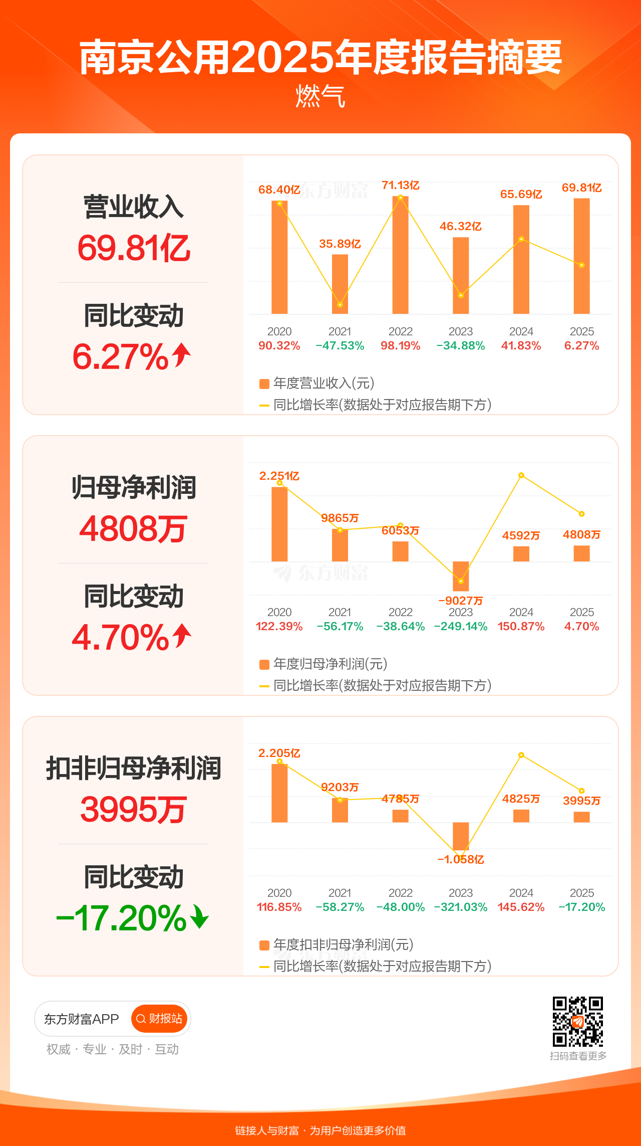 南京公用4月13日发布2025年年报显示,公司全年实现营业收入69.81亿元,同比增长6.27%;归母净利润4808.03万元,同比增长4.70%;扣非归母净利润3994.89万元,同比下滑17.20%。