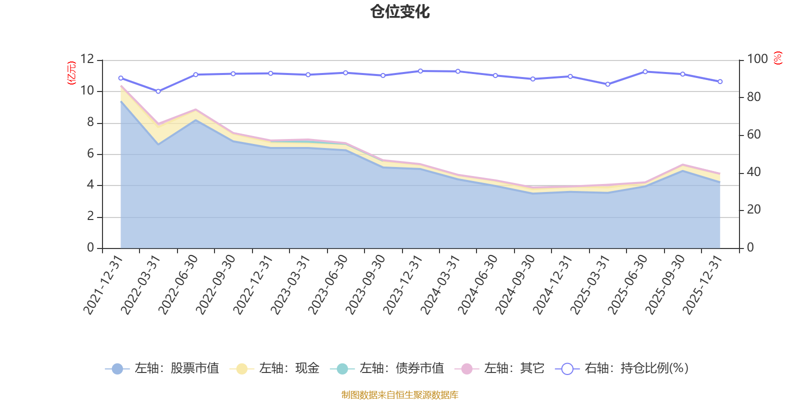 据定期报告数据统计,近三年平均股票仓位为91.68%,同类平均为85.83%。2023年末基金达到94.13%的最高仓位,2022年一季度末最低,为83.36%。