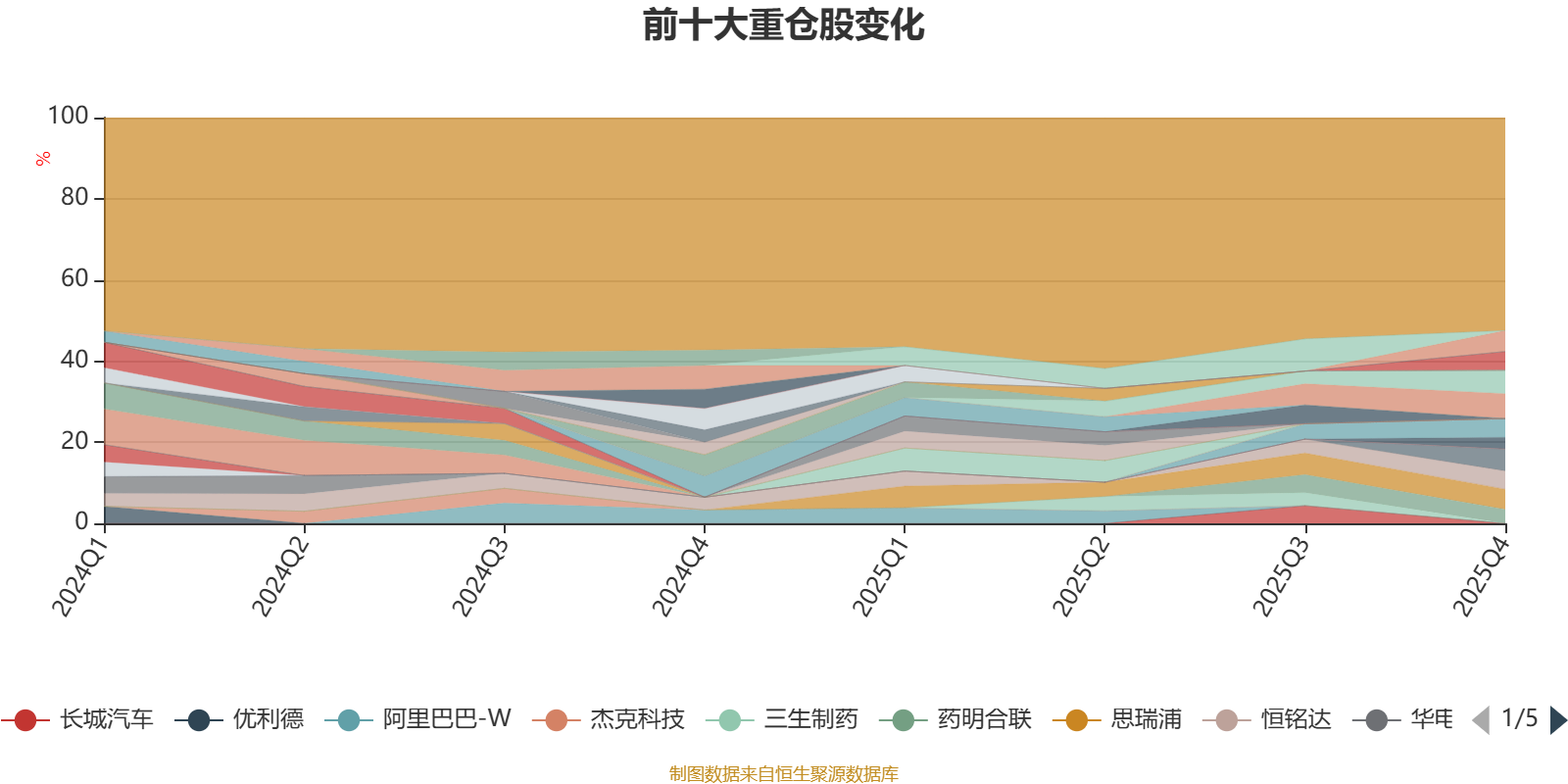 截至2025年末,基金十大重仓股分别是新易盛、隆鑫通用、寒武纪、紫金矿业、思瑞浦、中际旭创、上海复旦、恒铭达、药明合联、华新建材。