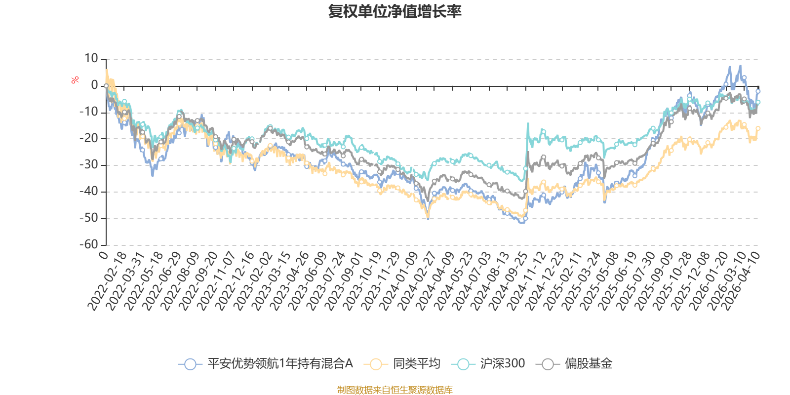 截至4月10日,平安优势领航1年持有混合A近三个月复权单位净值增长率为-0.81%,位于同类可比基金338/621;近半年复权单位净值增长率为4.56%,位于同类可比基金305/621;近一年复权单位净值增长率为67.30%,位于同类可比基金93/618;近三年复权单位净值增长率为36.09%,位于同类可比基金147/559。