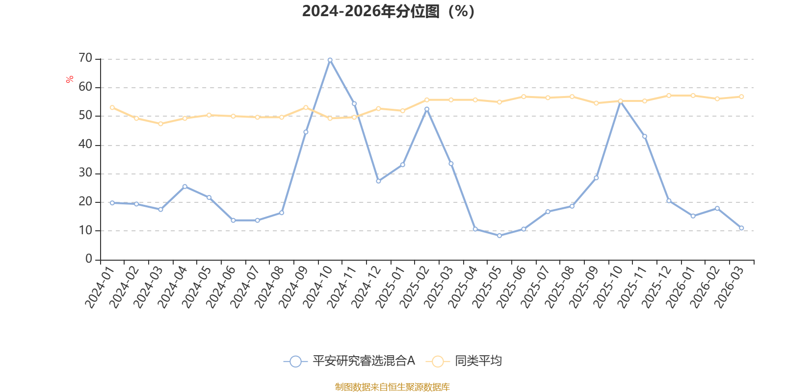 通过所选区间该基金净值增长率分位图,可以观察该基金与同类基金业绩比较情况。图为坐标原点到区间内某时点的净值增长率在同类基金中的分位数。