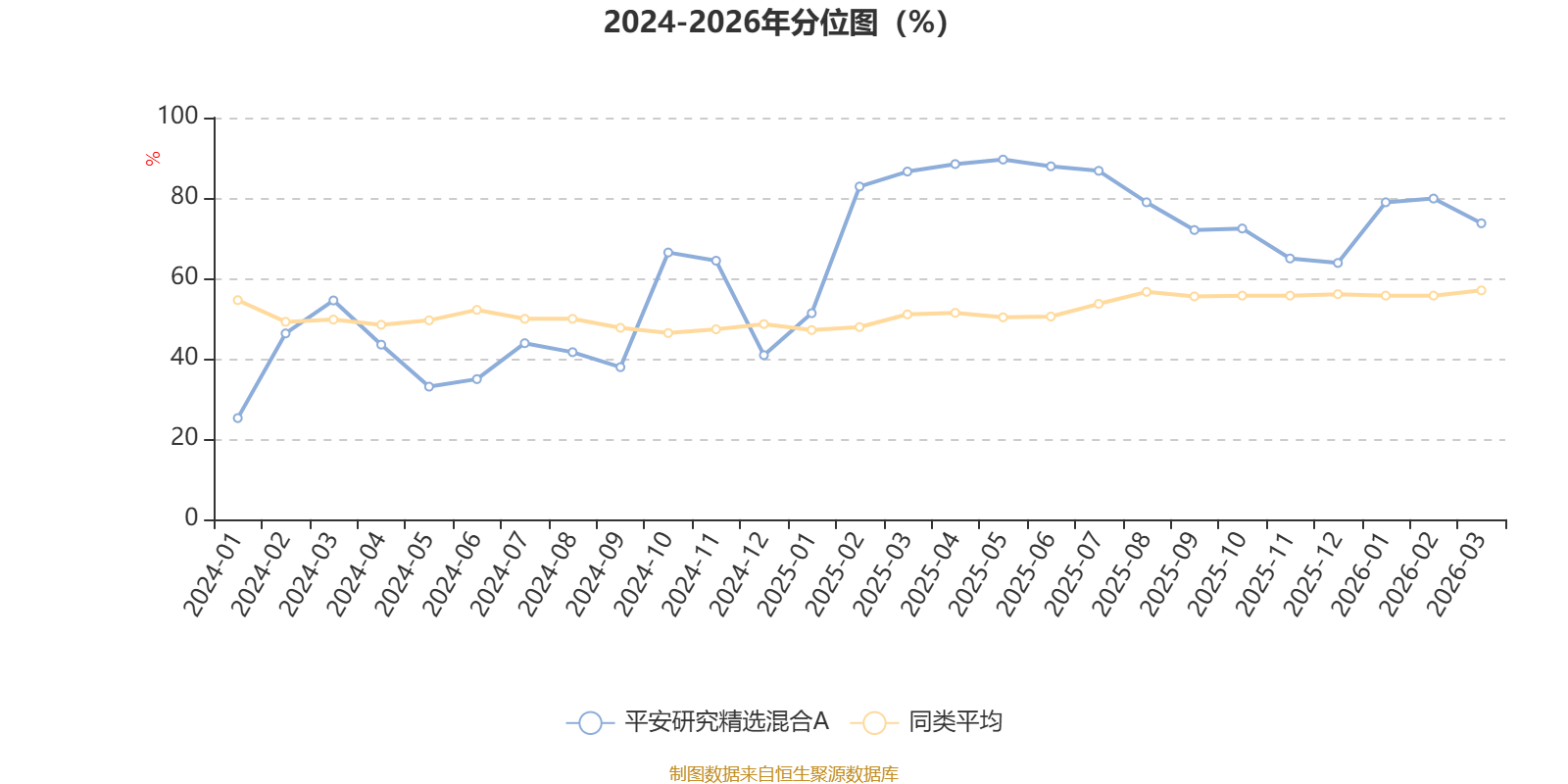 通过所选区间该基金净值增长率分位图,可以观察该基金与同类基金业绩比较情况。图为坐标原点到区间内某时点的净值增长率在同类基金中的分位数。