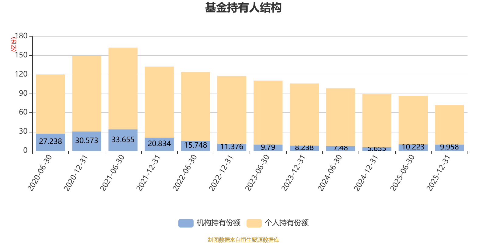 截至2025年12月31日,基金持有人共计31.93万户,合计持有72.35亿份。其中管理人员工持有4371.21万份,占比0.60%,机构持有份额占比13.76%,个人投资者占比86.24%。