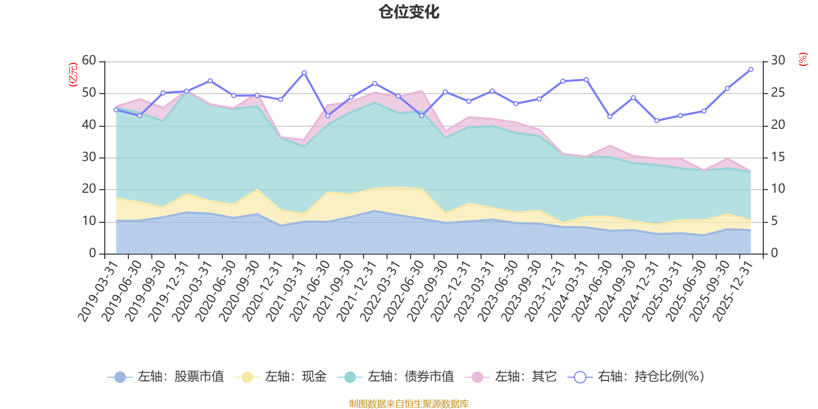 据定期报告数据统计,近三年平均股票仓位为24.32%,同类平均为19.2%。2025年末基金达到28.75%的最高仓位,2024年末最低,为20.76%。