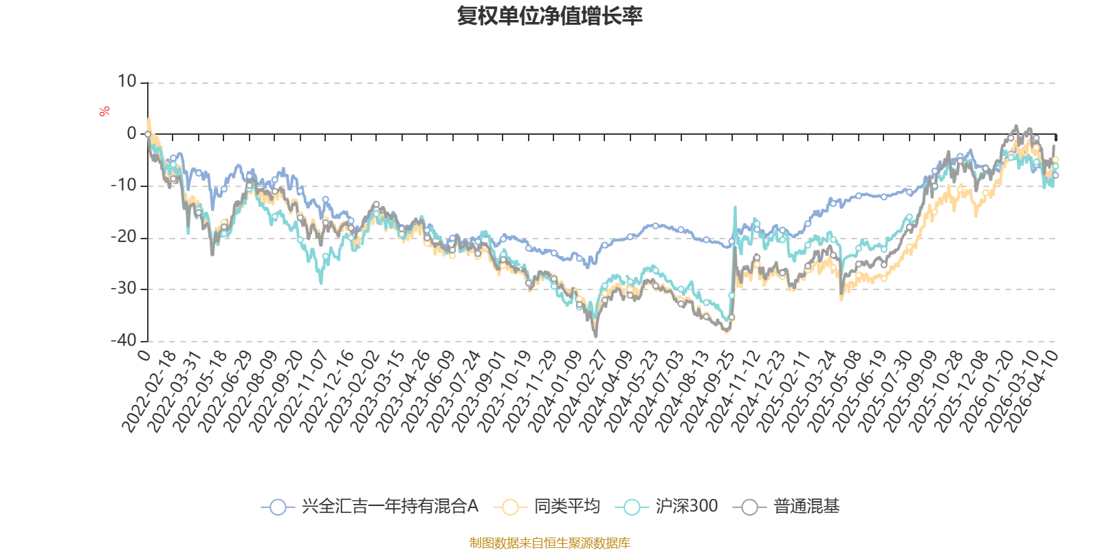 截至4月10日,兴全汇吉一年持有混合A近三个月复权单位净值增长率为-2.72%,位于同类可比基金96/134;近半年复权单位净值增长率为-2.96%,位于同类可比基金113/134;近一年复权单位净值增长率为6.52%,位于同类可比基金121/134;近三年复权单位净值增长率为11.50%,位于同类可比基金74/126。