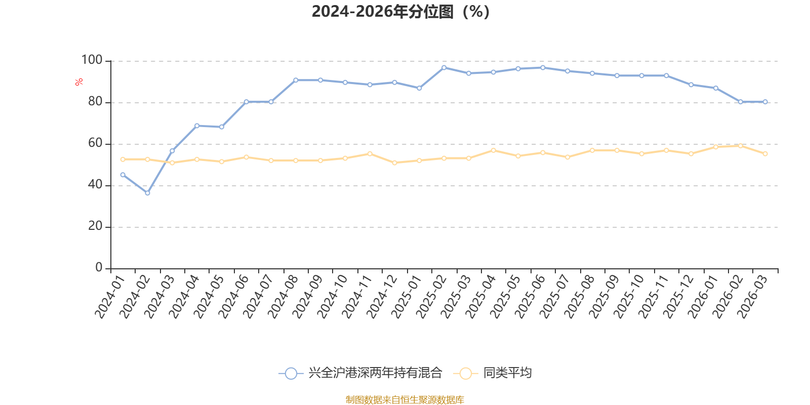 通过所选区间该基金净值增长率分位图,可以观察该基金与同类基金业绩比较情况。图为坐标原点到区间内某时点的净值增长率在同类基金中的分位数。