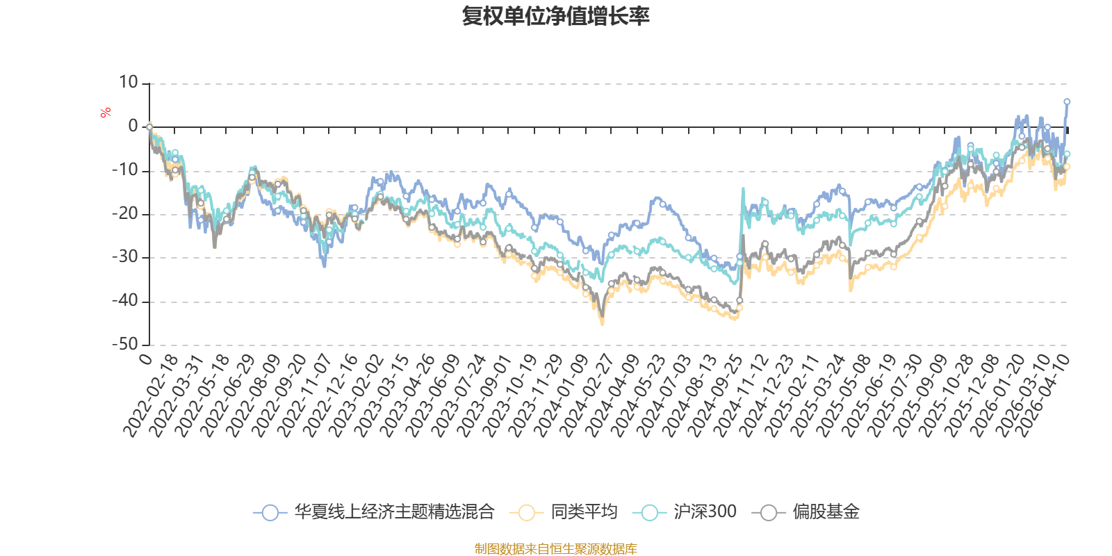 截至4月10日,华夏线上经济主题精选混合近三个月复权单位净值增长率为5.39%,位于同类可比基金30/185;近半年复权单位净值增长率为13.42%,位于同类可比基金28/185;近一年复权单位净值增长率为31.87%,位于同类可比基金106/185;近三年复权单位净值增长率为22.34%,位于同类可比基金74/177。