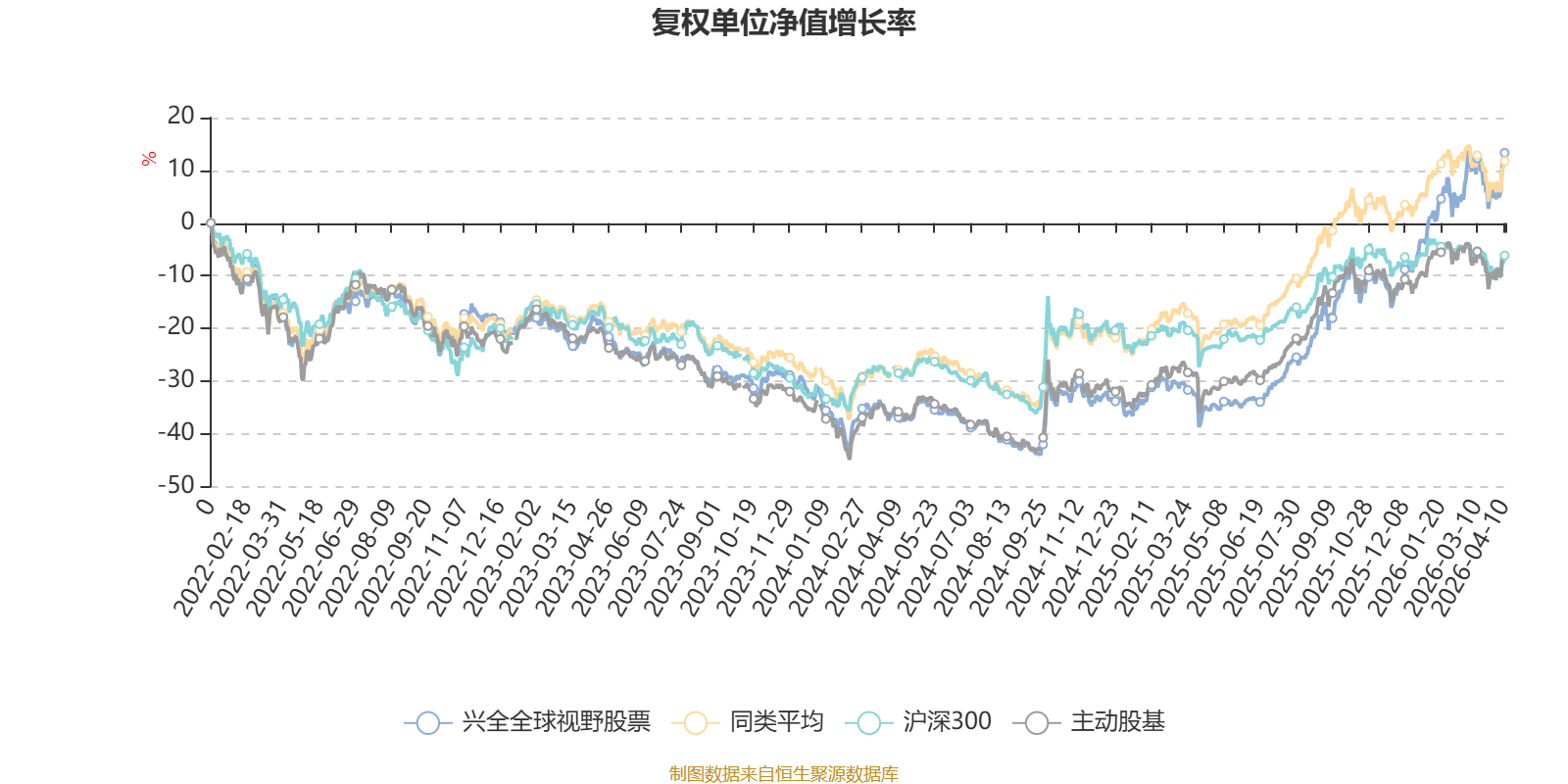 截至4月10日,兴全全球视野股票近三个月复权单位净值增长率为11.49%,位于同类可比基金4/58;近半年复权单位净值增长率为25.17%,位于同类可比基金4/58;近一年复权单位净值增长率为76.41%,位于同类可比基金5/57;近三年复权单位净值增长率为38.80%,位于同类可比基金20/57。