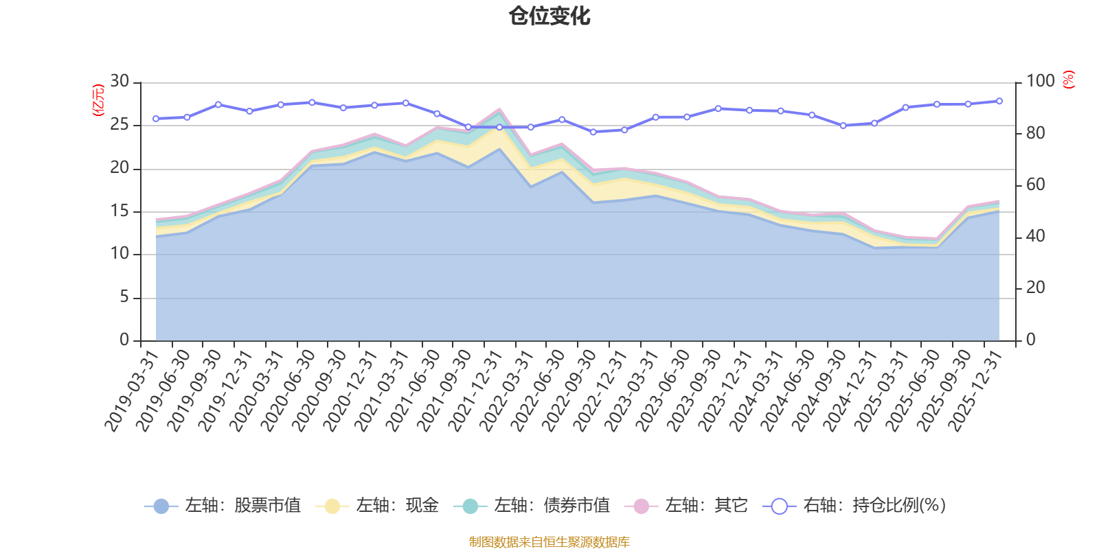据定期报告数据统计,近三年平均股票仓位为88.51%,同类平均为88.64%。2025年末基金达到92.77%的最高仓位,2022年三季度末最低,为80.78%。