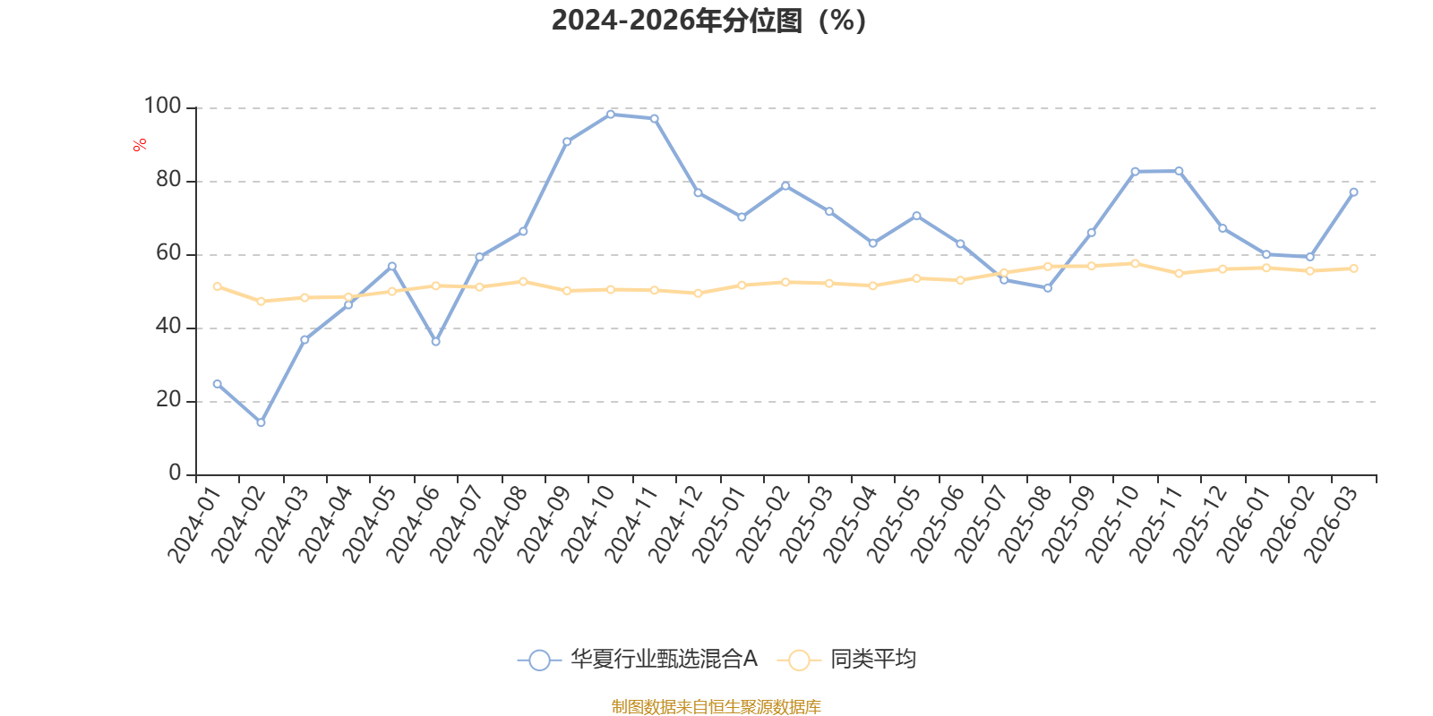 通过所选区间该基金净值增长率分位图,可以观察该基金与同类基金业绩比较情况。图为坐标原点到区间内某时点的净值增长率在同类基金中的分位数。