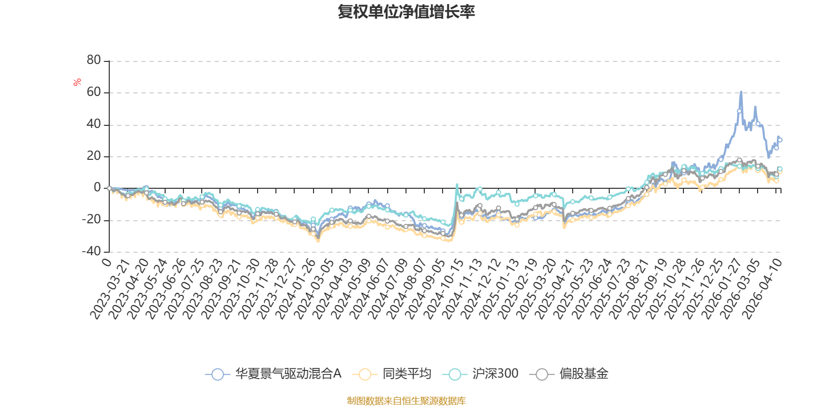 截至4月10日,华夏景气驱动混合A近三个月复权单位净值增长率为2.03%,位于同类可比基金232/621;近半年复权单位净值增长率为15.88%,位于同类可比基金82/621;近一年复权单位净值增长率为61.51%,位于同类可比基金111/618;近三年复权单位净值增长率为31.30%,位于同类可比基金183/559。