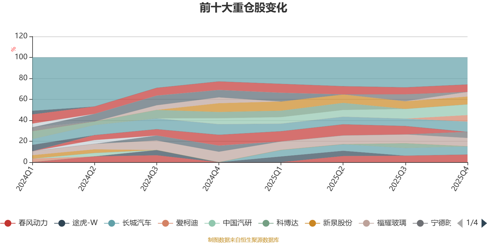 截至2025年末,基金十大重仓股分别是敏实集团、宇通客车、福耀玻璃、长城汽车、吉利汽车、春风动力、拓普集团、潍柴动力、宁德时代、隆鑫通用。