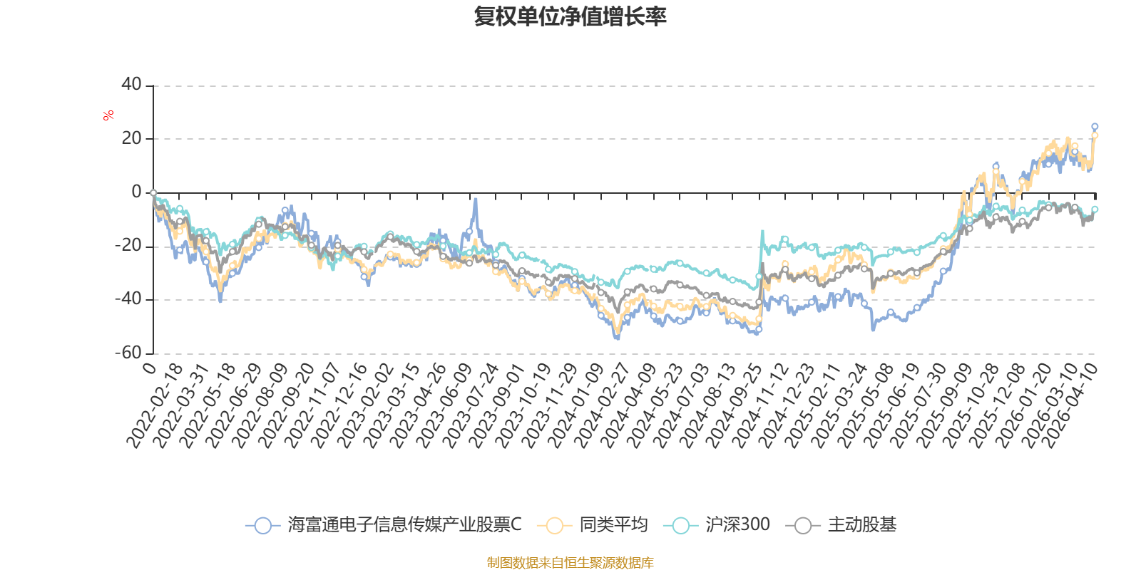 截至4月10日,海富通电子信息传媒产业股票C近三个月复权单位净值增长率为11.81%,位于同类可比基金16/63;近半年复权单位净值增长率为24.44%,位于同类可比基金19/63;近一年复权单位净值增长率为144.15%,位于同类可比基金11/63;近三年复权单位净值增长率为53.70%,位于同类可比基金25/53。