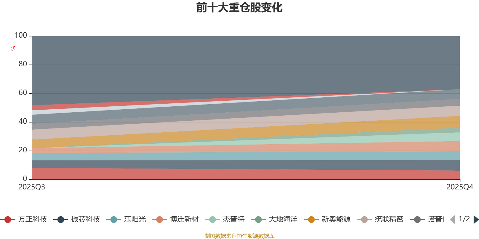 该基金持股集中度较高。截至2025年末,基金十大重仓股分别是新奥能源、振芯科技、博迁新材、统联精密、洁美科技、杰普特、方正科技、东阳光、诺普信、大地海洋。